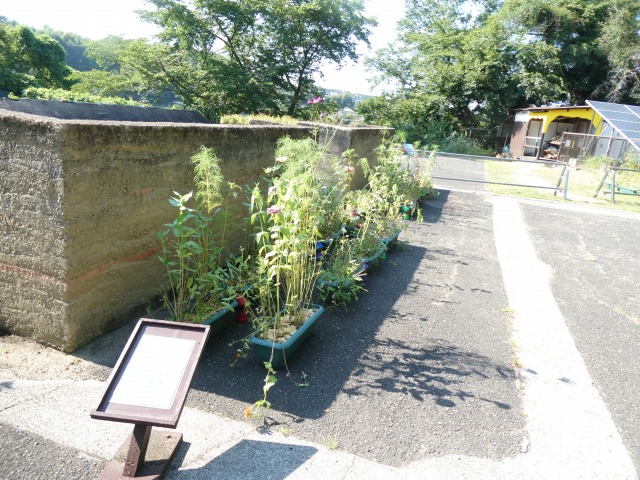 花の文化園の浅型プランターのたねダンゴ🄬 展示3か月経過でバックヤード移動モードに